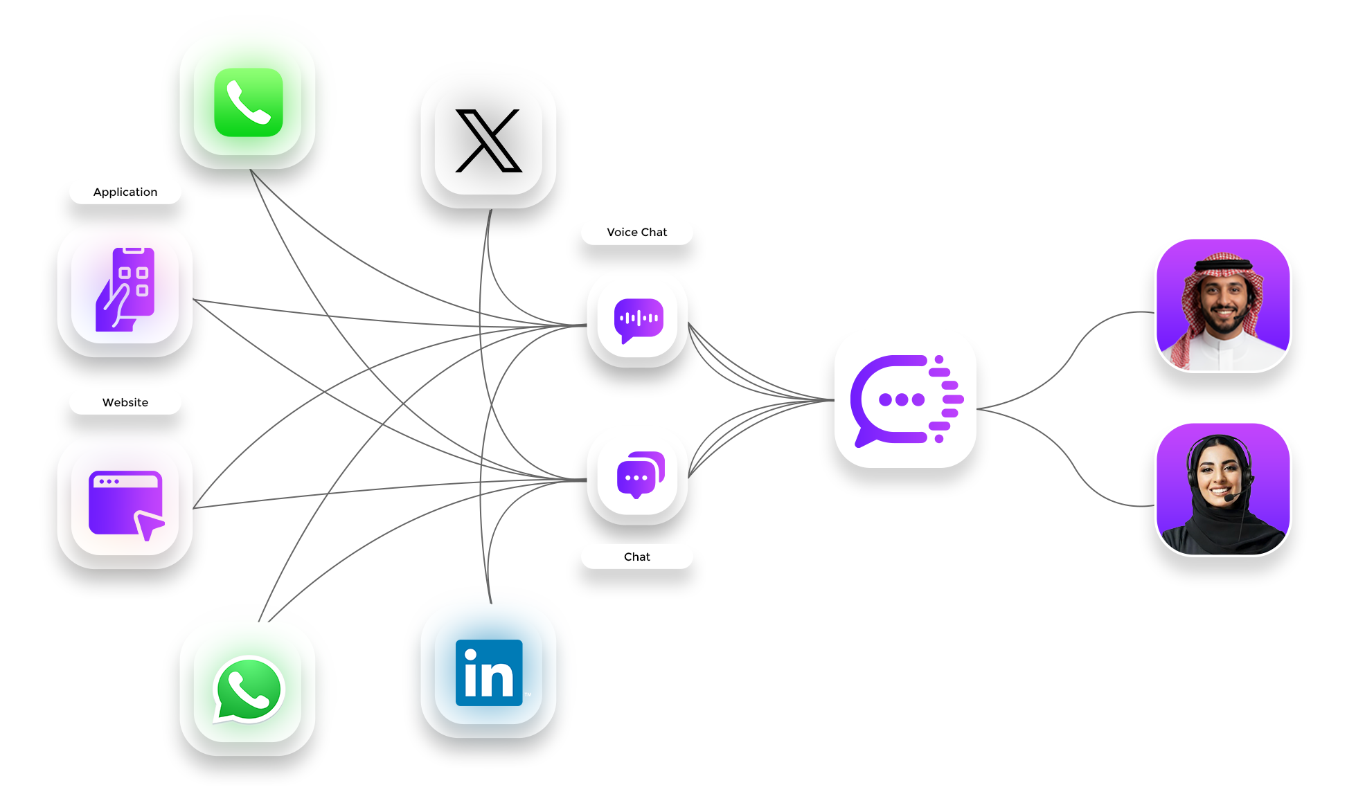 تفاعل موحّد متعدد القنوات (الدردشة على الويب، واتساب، تيليجرام، وسائل التواصل الاجتماعي)